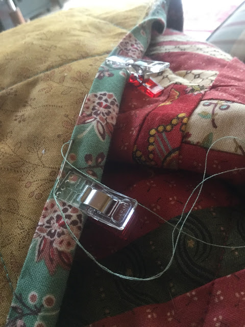 I took the scrapes from the front and made random four inch squares to incorporate somehow on the back. That created the dilemma of how to incorporate them. I had a light bulb moment when I was tossing the squares around the countertop to arrange them......and I thought, that’s it! Add them as if you were experimenting with a layout. I am happy with the quilt for two reasons. First is it a finish. More importantly I purchased the pattern and fabric when I was in Georgia working on clearing up my brother's belongings after his passed away a couple of years ago. One afternoon my sister and I took a break and we went on an explore and came across a wonderful quilt shop. A Scarlet Thread. Of course we shopped and this is where I bought the pattern and fabric. I will always think of my brother when I use this quilt.
