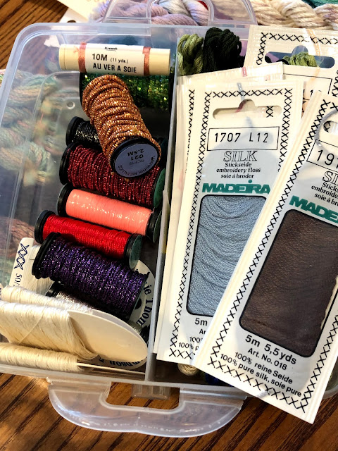 Because I am in the yard, I have done very little stitching. I try to put in a few stitches when I stop for lunch but even after scrubbing I still have ground in dirt on my hands even though I wear gloves. That said, I somehow managed two new starts. As always, I have total justification for them. The first one is "With this needle, I thee thread" from Hands on Design. Justification - I met with my Tuesday night stitchers for the first time in about 11 months and I needed something small to take along and stitch. Legit, right? It wasn't until I was stitching on the fob in the lower right that I realized I stitched every shorter spool of thread wrong....and guess what, they are staying that way!